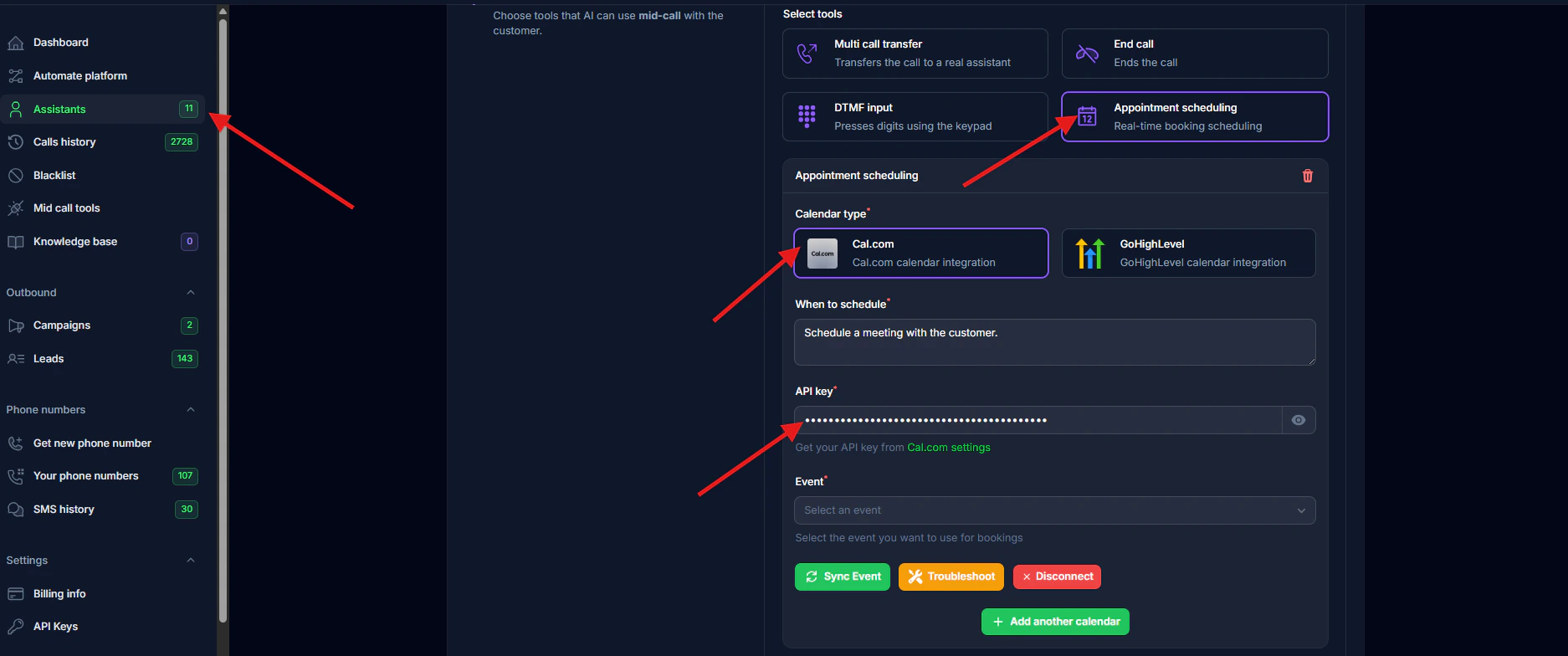 - In your assistant settings → Tools tab → Appointment Scheduling