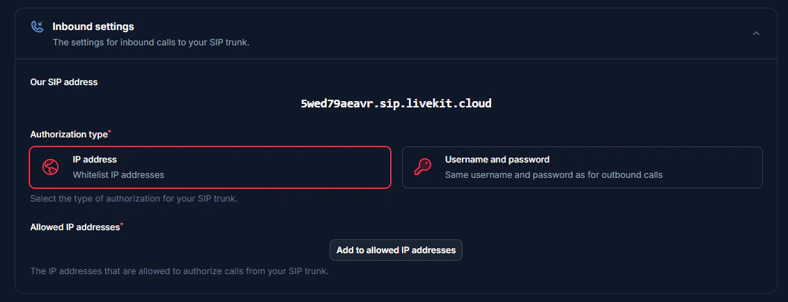 5wed79aeavr.sip.livekit.cloud. Your SIP provider must be configured to send inbound calls to this address by pointing their outbound trunk or routing rule to this URI. - IP Address (Whitelist IPs) - If your SIP provider can send calls from a known set of public IP addresses, choose IP Address. Then add each provider IP to the whitelist under Inbound Authentication.