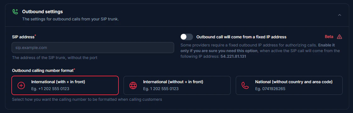 This tells our system how to format phone numbers when making calls. Choose based on your provider’s requirements:-